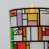 While in use, breaks in the design emit patterns of light. The glass container is decorated with 11 color artwork, applied by hand and permanently fused to the vessel via heat transfer at our studio. Sleeve around the box is a craft project just for you: Cut, glue and build your own paper cover for the tower. The box itself is upcycled.
