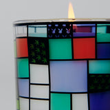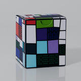 While in use, breaks in the design emit patterns of light. The glass container is decorated with 11 color artwork, applied by hand and permanently fused to the vessel via heat transfer at our studio.  Sleeve around the box is a craft project just for you: Cut, glue and build your own paper cover for the tower. The box itself is upcycled.
